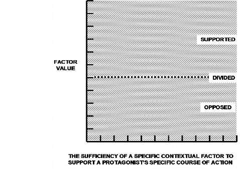 A value is derived from the index to represent the sufficiency of the factor as it relates to the certainty of providing support or opposition to a specific course of action to divest the antagonist of his precious (cA). Using simple X Y graphs , and expert analysis, the sufficiency of each specific contextual factor can be plotted to obtain the value of the specific factor for the equation. The equation combines these values to determine a synergistic factorial sufficiency value (x), which will be factored against the certainty (cA), thus leading to a prediction of the success or failure of the intended deterrence effort.